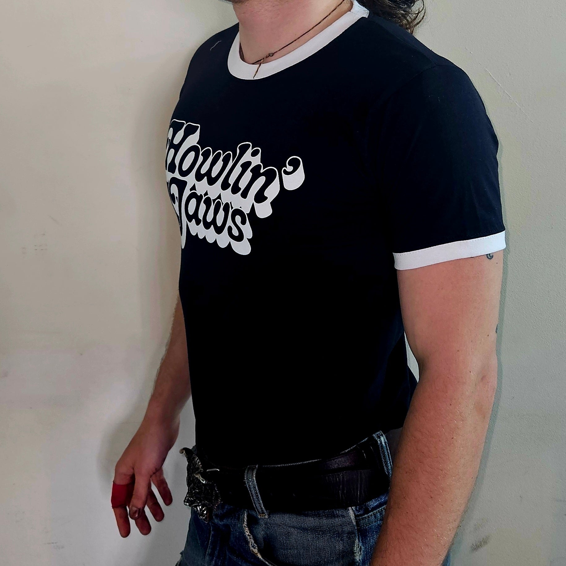 Tee-shirt noir manches courtes, liserets blancs au col et aux manches, logo "Howlin' Jaws" blanc sérigraphié à Montreuil, coupe unisexe,