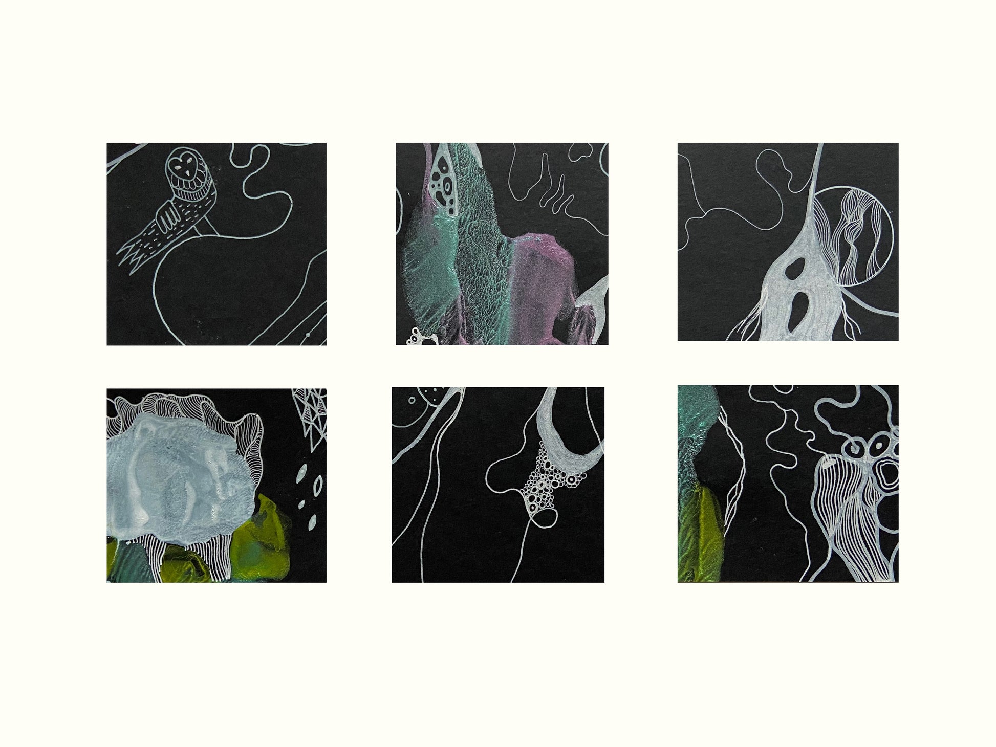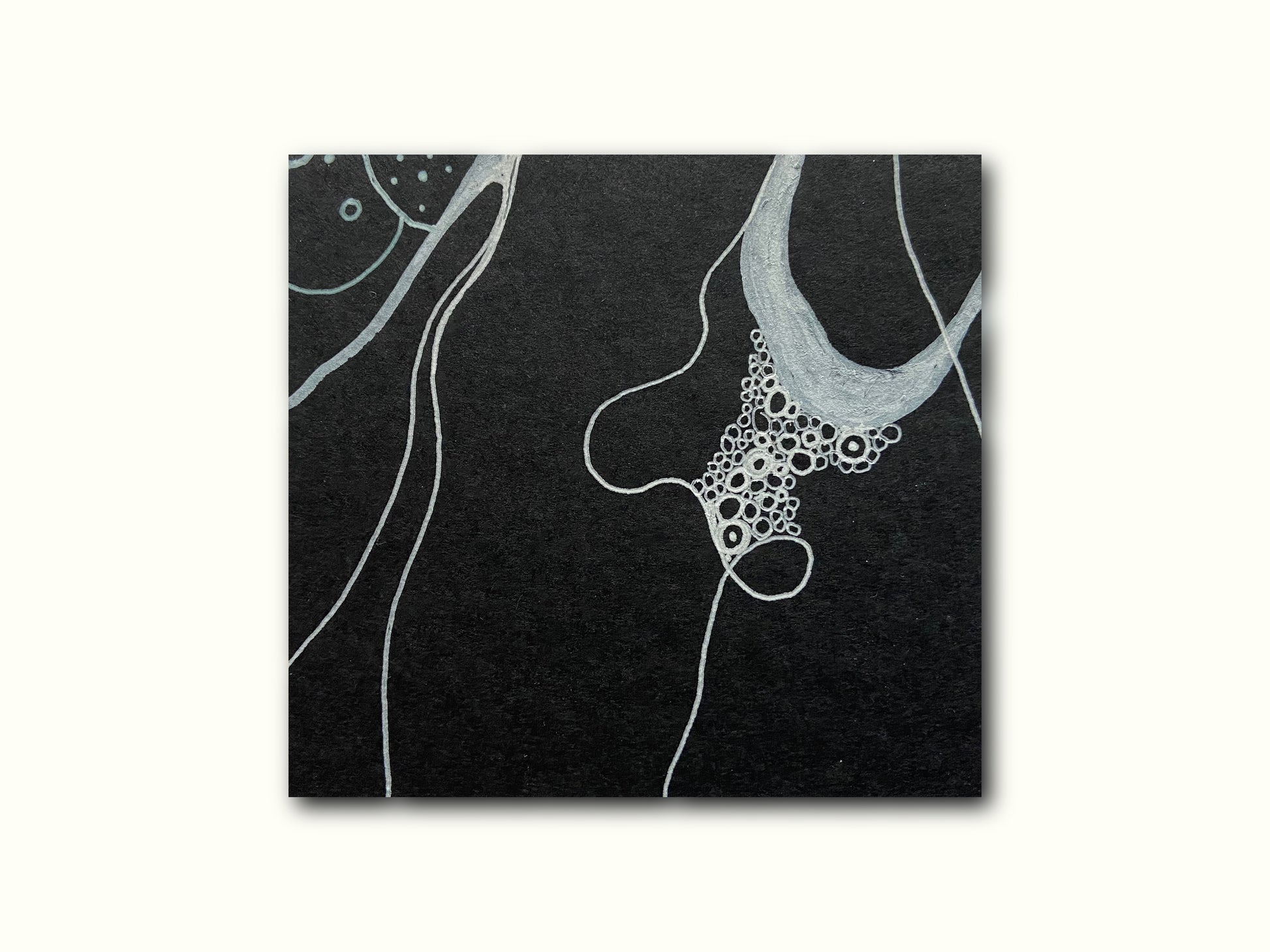 (Chaque dessin, unique, au format 7 x 7 cm sur papier noir 150gr, est un morceau